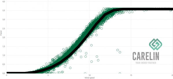 Tehokäyrien tarkastelu ei välttämättä ole voimalatoimittajan näkökulmasta oleellisin asia seurata säännöllisesti, mutta omistajalle koneen alisuoriutuminen aiheuttaa välittömästi tuotannonmenetyksiä. Alisuoriutuminen tällä osa-alueella ei näy käytettävyysperusteisessa seurannassa, vaikka se voi vuositasolla aiheuttaa jopa yli 10 prosentin tuotannonmenetyksen optimaaliseen vuosituotantoon nähden. Carelin Production Performance Analysis visualisoi tehokäyrät tietyllä seurantajaksolla ja määrittää voimalan yli- tai alisuoriutumisen megawattitunteina ja euroina.